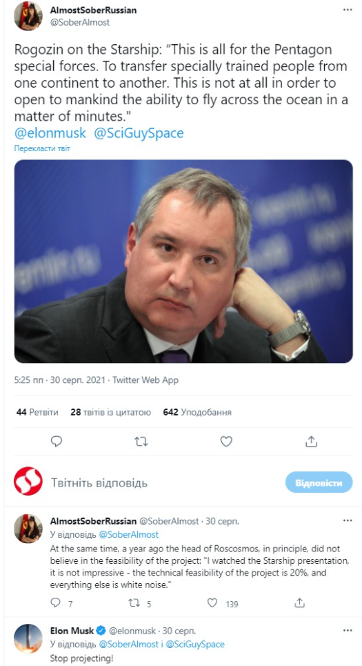 глава роскосмосу дмитро рогозін звинуватив ілона маска, засновника аерокосмічної компанії spacex, що працює над космічним кораблем starship, в роботі на пентагон. На думку генерального директора роскосмосу, мільярдер скористається цією розробкою для міжконтинентального перекидання військового спецназу, а гроші на розробку йому покриває управління міністерства оборони сполучених штатів америки.